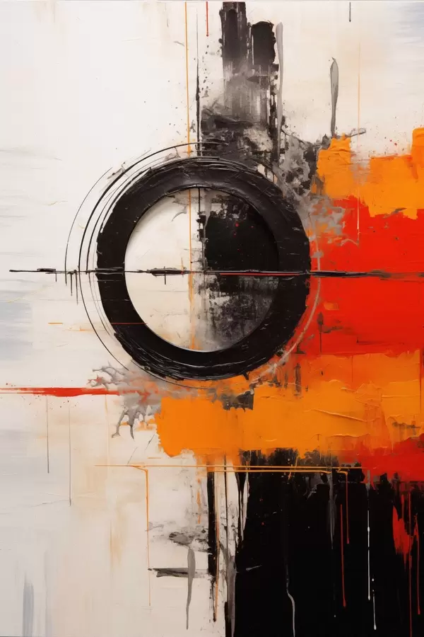 Poster Círculo negro sobre fondo blanco, trazos y salpicaduras naranjas. Nr f46549