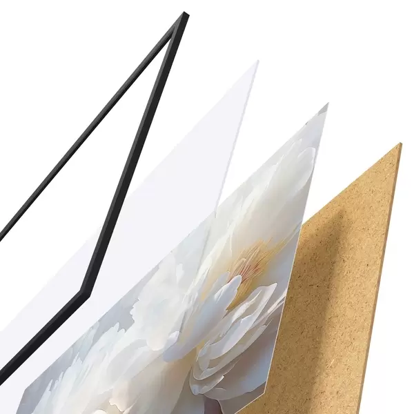 El póster consta de marco, plexiglás, imagen impresa y soporte de aglomerado. El póster puede colgarse inmediatamente en la pared gracias a los soportes de la parte posterior.