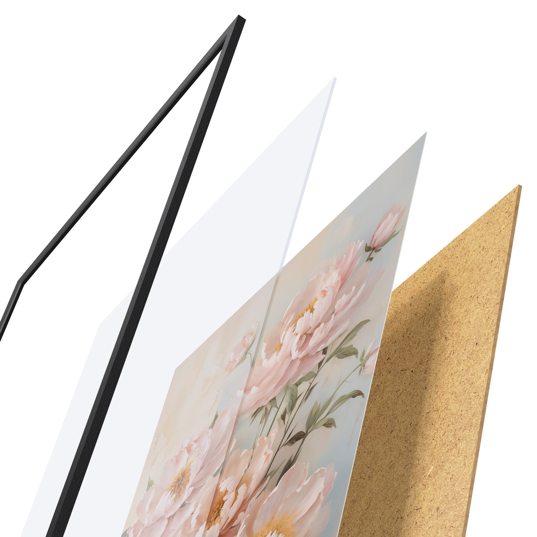 El póster consta de marco, plexiglás, imagen impresa y soporte de aglomerado. El póster puede colgarse inmediatamente en la pared gracias a los soportes de la parte posterior.