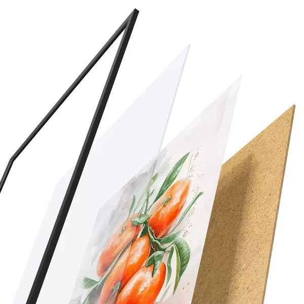El póster consta de marco, plexiglás, imagen impresa y soporte de aglomerado. El póster puede colgarse inmediatamente en la pared gracias a los soportes de la parte posterior.