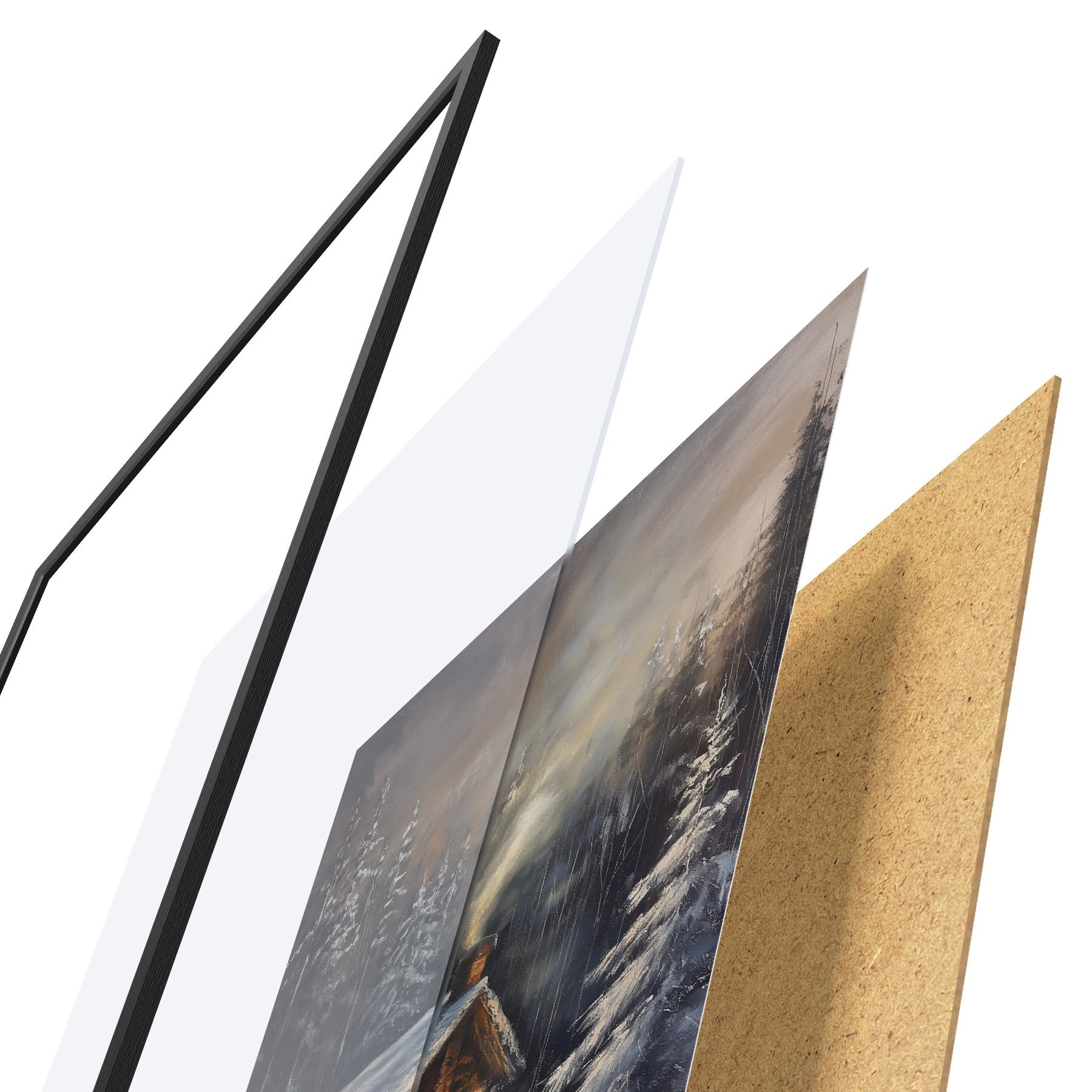 El póster consta de marco, plexiglás, imagen impresa y soporte de aglomerado. El póster puede colgarse inmediatamente en la pared gracias a los soportes de la parte posterior.