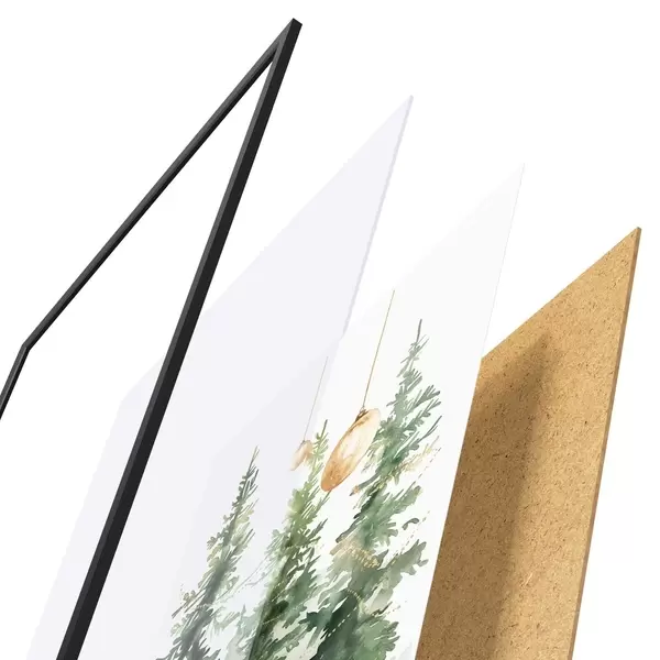 El póster consta de marco, plexiglás, imagen impresa y soporte de aglomerado. El póster puede colgarse inmediatamente en la pared gracias a los soportes de la parte posterior.