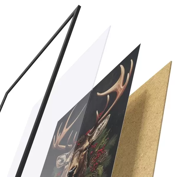El póster consta de marco, plexiglás, imagen impresa y soporte de aglomerado. El póster puede colgarse inmediatamente en la pared gracias a los soportes de la parte posterior.