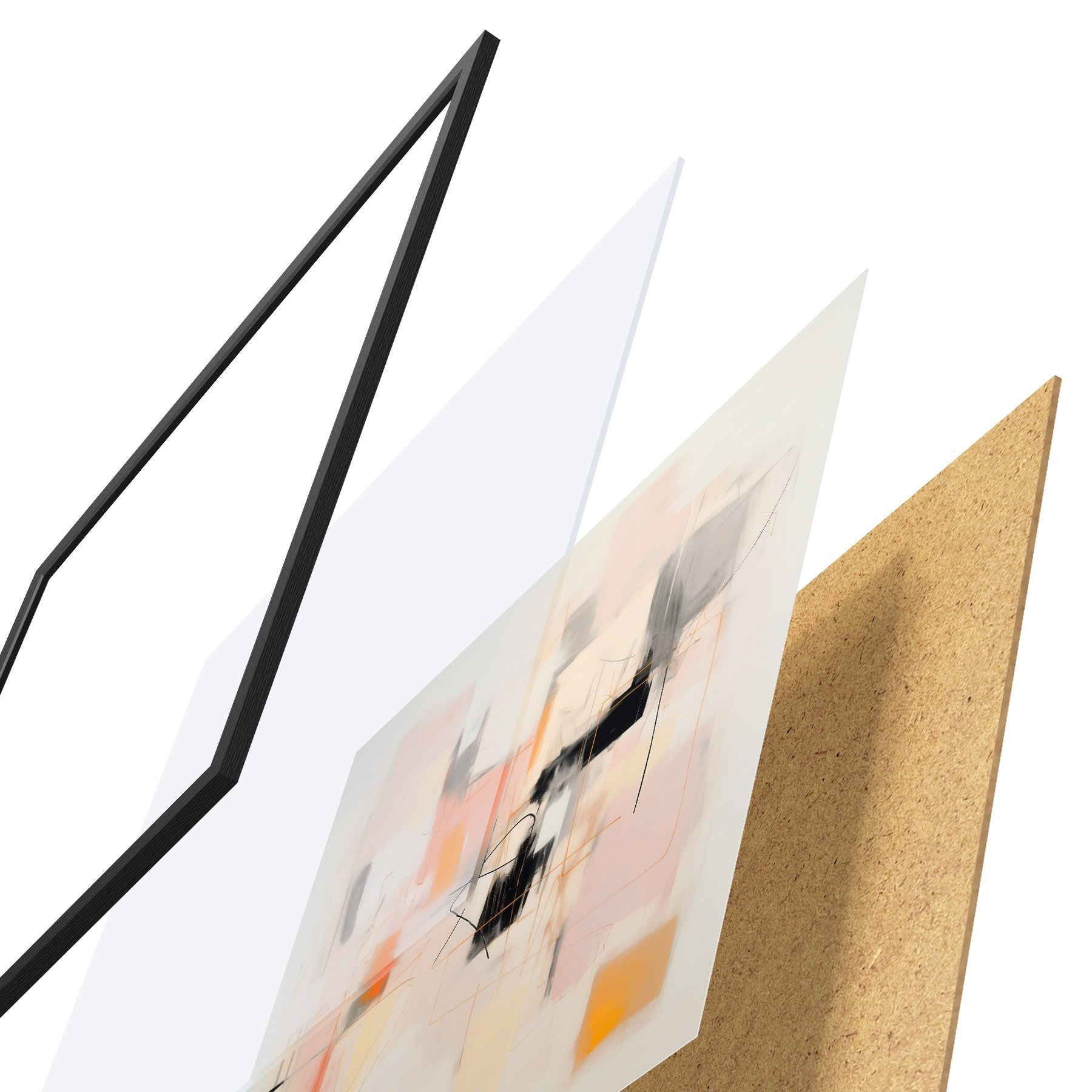 El póster consta de marco, plexiglás, imagen impresa y soporte de aglomerado. El póster puede colgarse inmediatamente en la pared gracias a los soportes de la parte posterior.