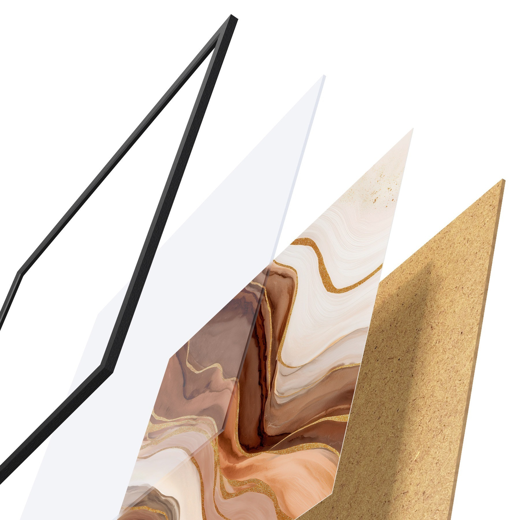 El póster consta de marco, plexiglás, imagen impresa y soporte de aglomerado. El póster puede colgarse inmediatamente en la pared gracias a los soportes de la parte posterior.