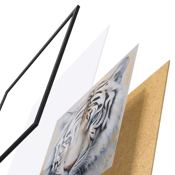 El póster consta de marco, plexiglás, imagen impresa y soporte de aglomerado. El póster puede colgarse inmediatamente en la pared gracias a los soportes de la parte posterior.