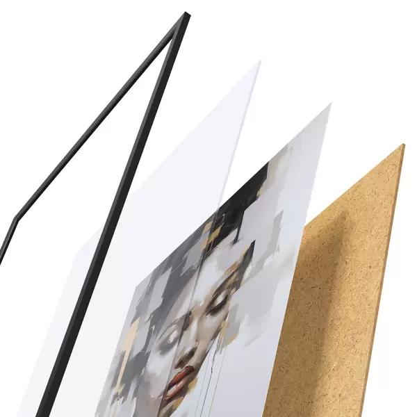 El póster consta de marco, plexiglás, imagen impresa y soporte de aglomerado. El póster puede colgarse inmediatamente en la pared gracias a los soportes de la parte posterior.