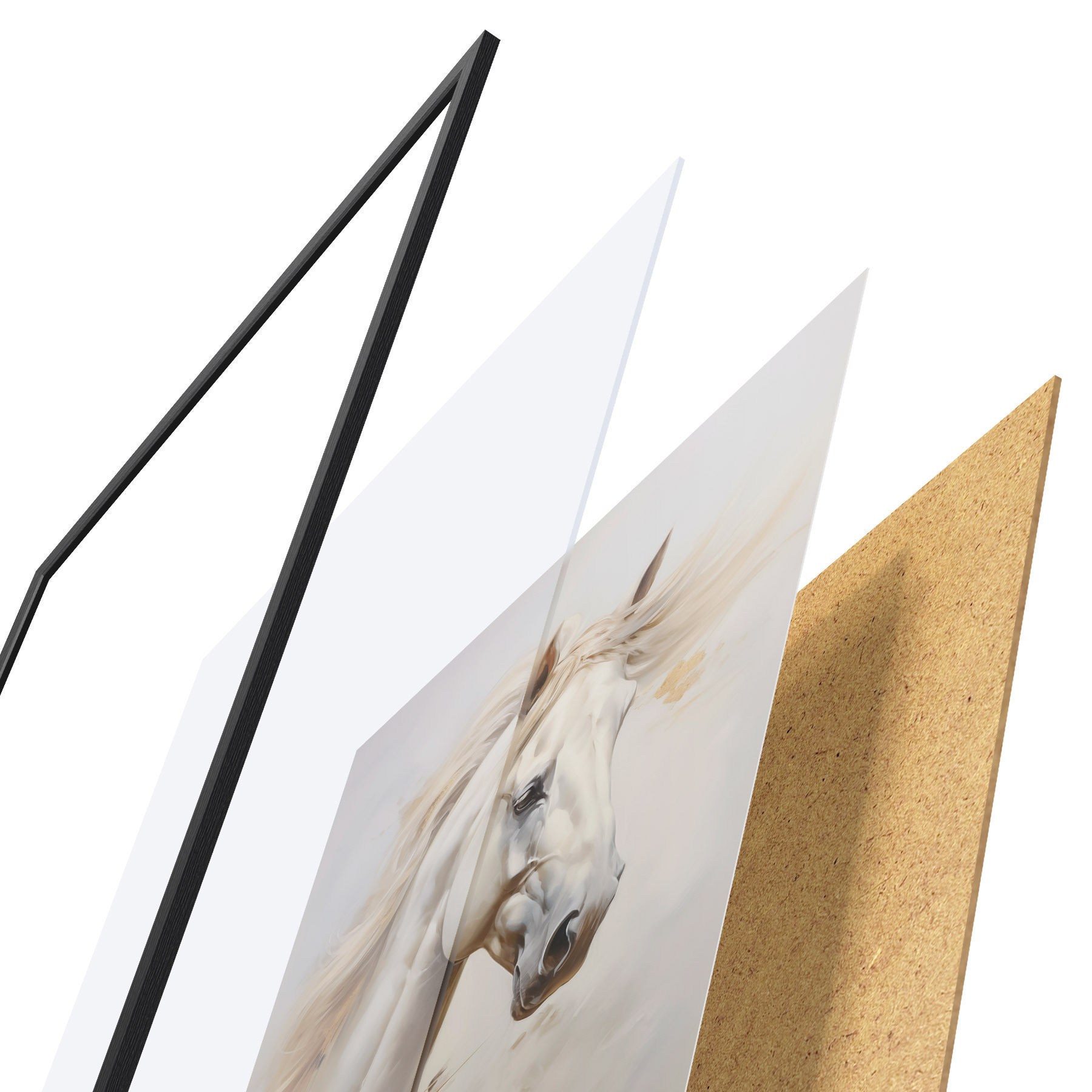 El póster consta de marco, plexiglás, imagen impresa y soporte de aglomerado. El póster puede colgarse inmediatamente en la pared gracias a los soportes de la parte posterior.