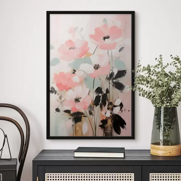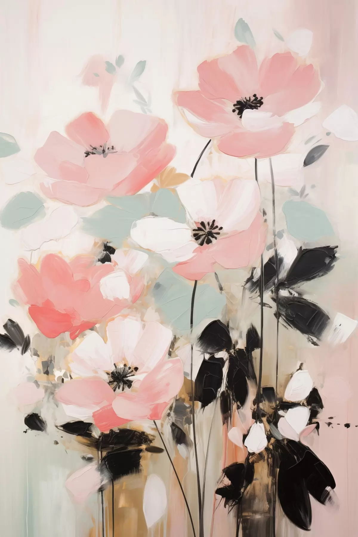 Poster Flores rosas y negras con hojas, colores pastel suaves, arreglo floral abstracto, arte minimalista. Nr f46688