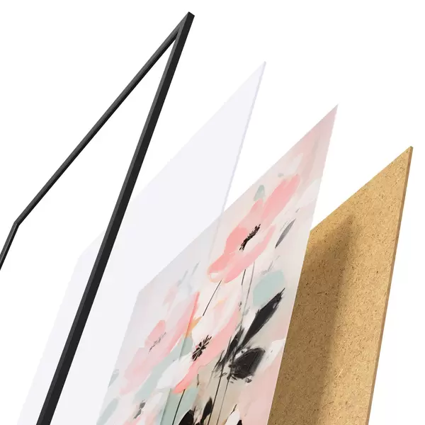 El póster consta de marco, plexiglás, imagen impresa y soporte de aglomerado. El póster puede colgarse inmediatamente en la pared gracias a los soportes de la parte posterior.
