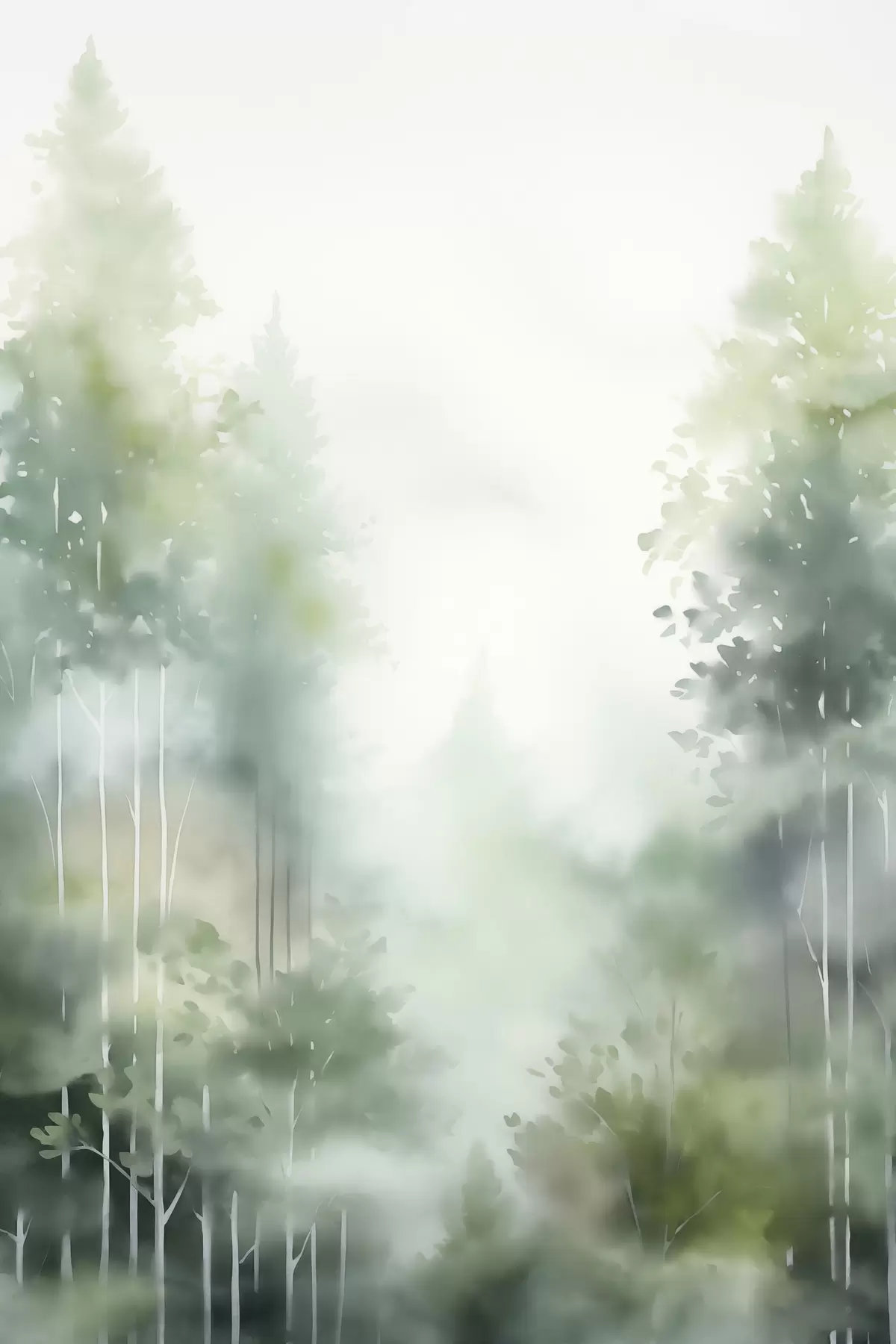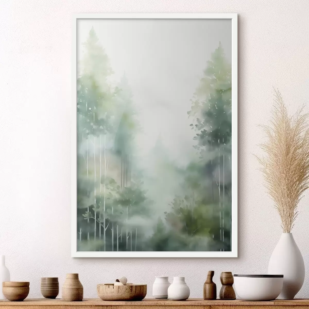 Poster Imitación de pintura en acuarela de un bosque abstracto con árboles altos y follaje verde, colores suaves y apagados. f46689