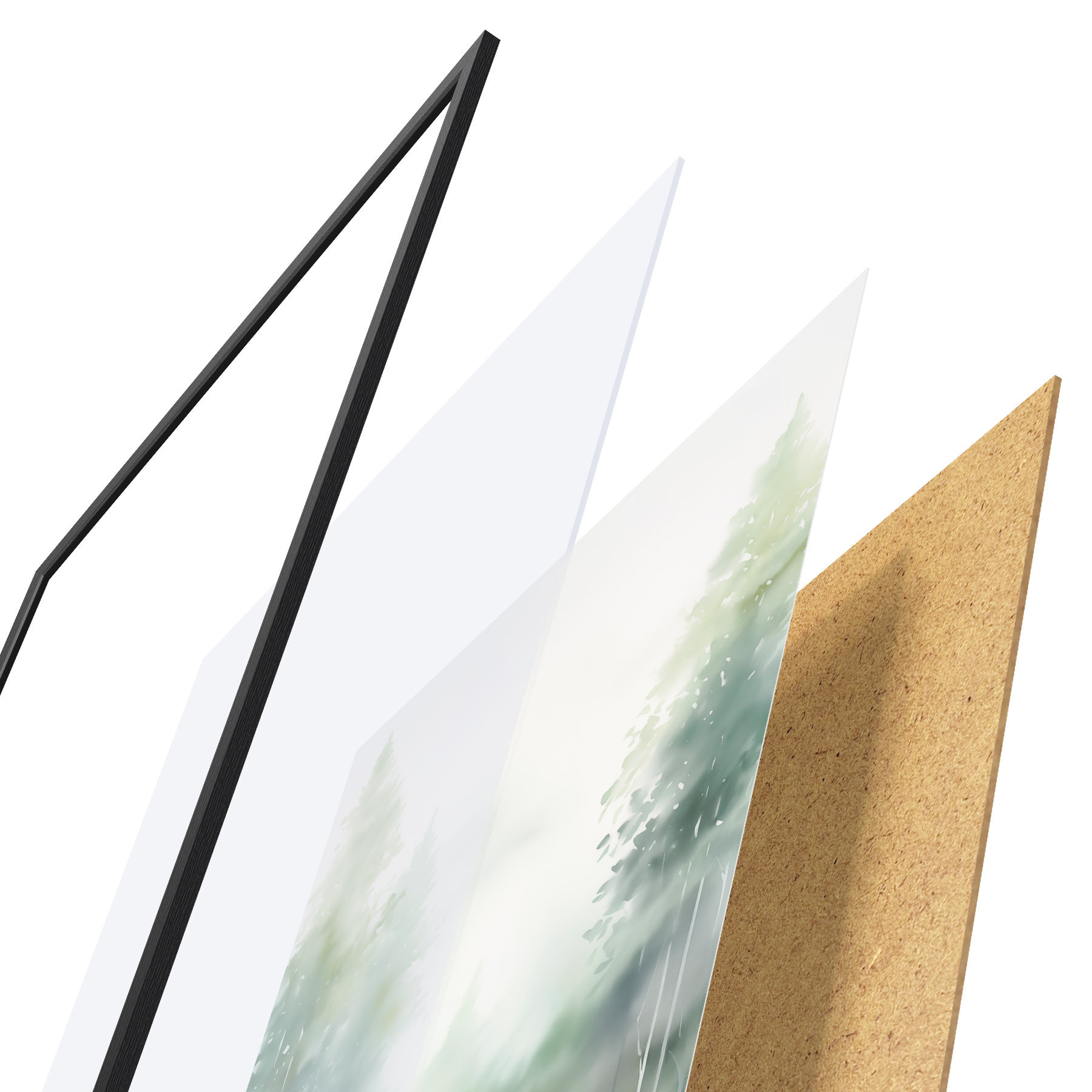 El póster consta de marco, plexiglás, imagen impresa y soporte de aglomerado. El póster puede colgarse inmediatamente en la pared gracias a los soportes de la parte posterior.