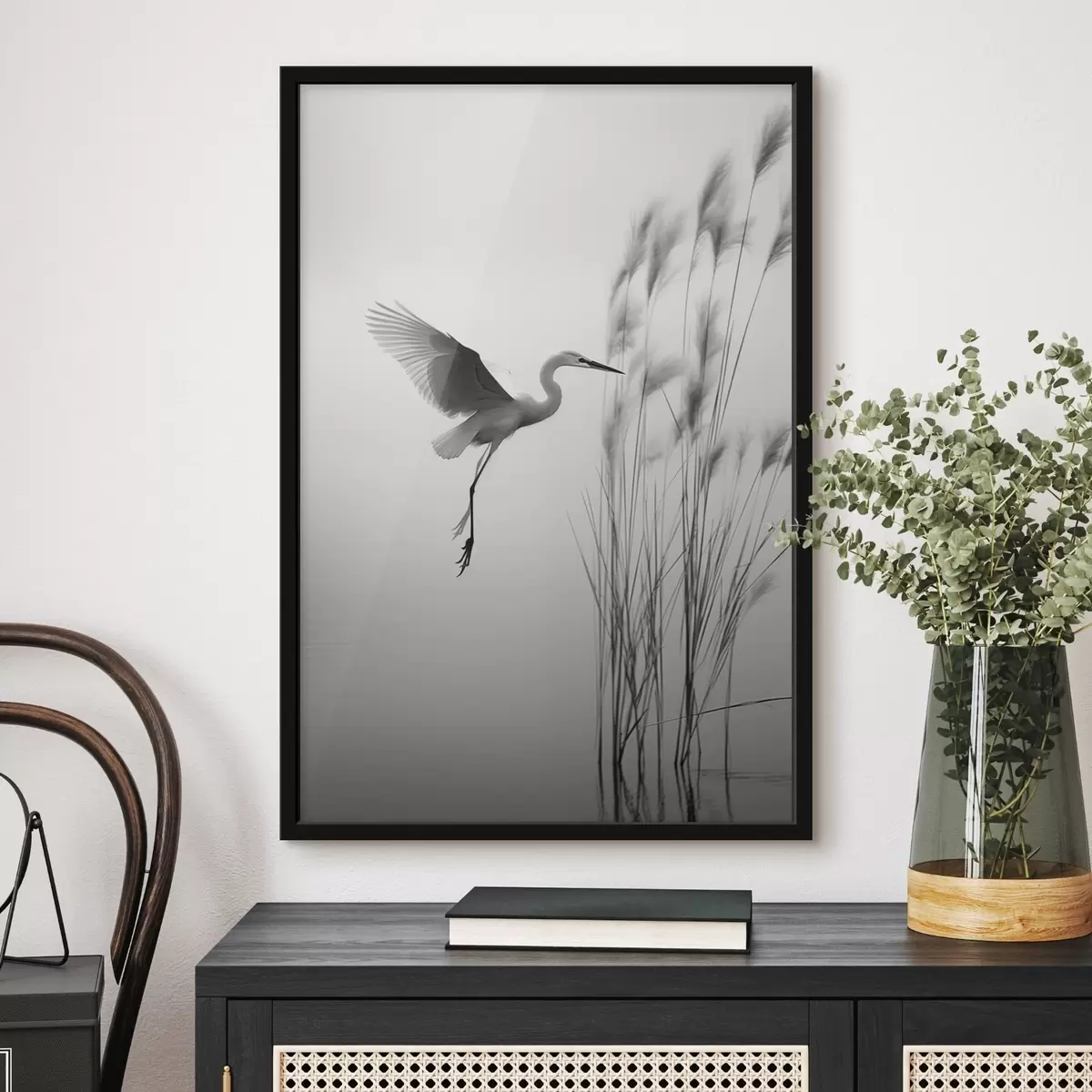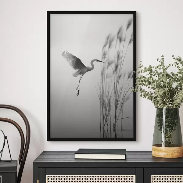 Poster Una garza blanca con las alas extendidas, volando cerca de altos juncos, composición minimalista en blanco y negro. Nr f46693
