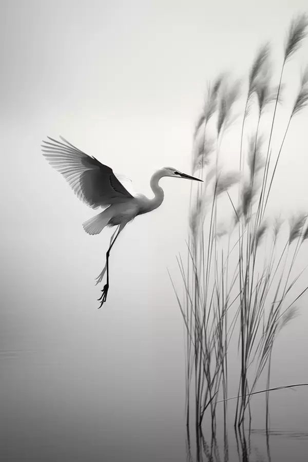 Poster Una garza blanca con las alas extendidas, volando cerca de altos juncos, composición minimalista en blanco y negro. Nr f46693