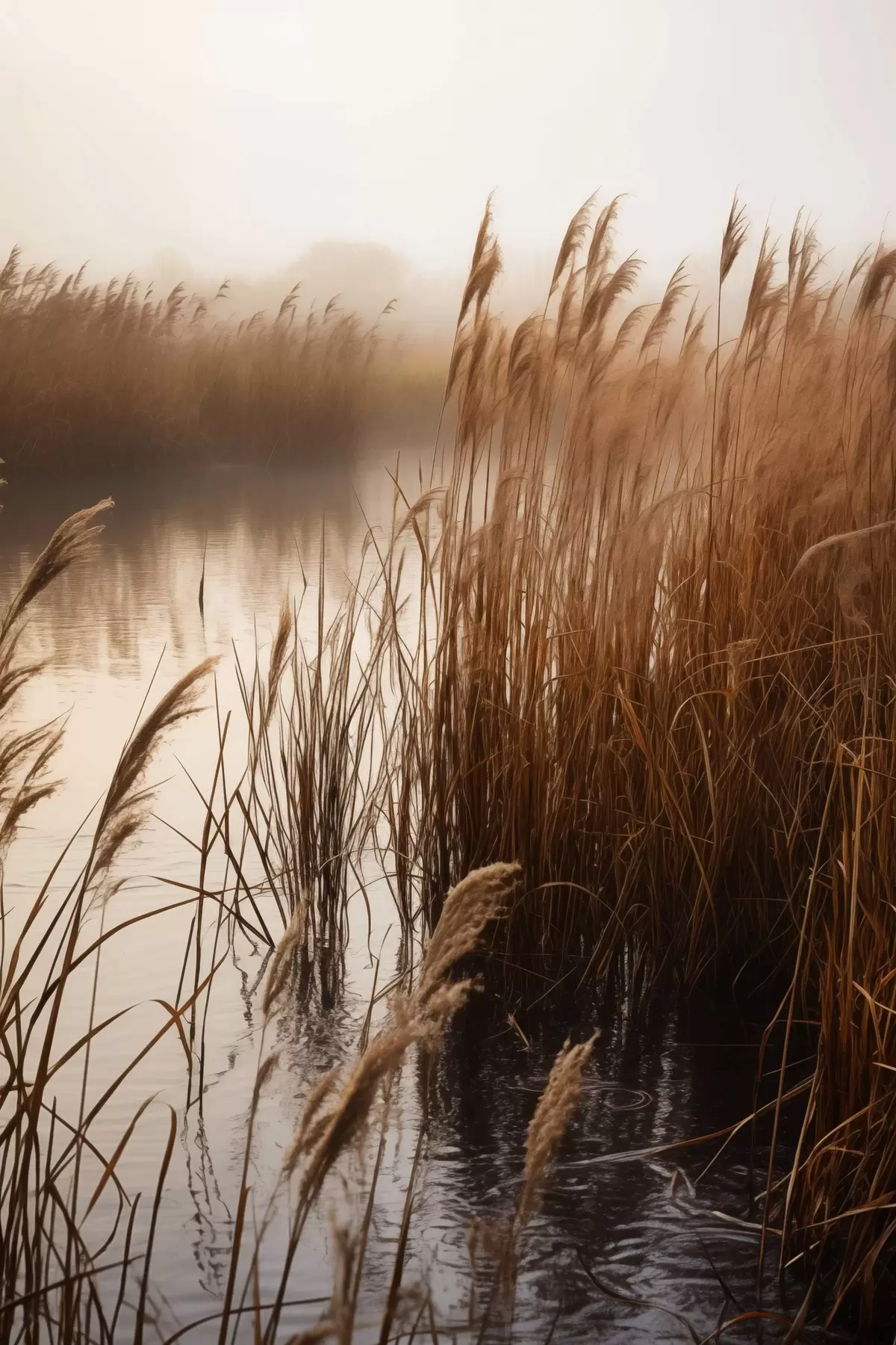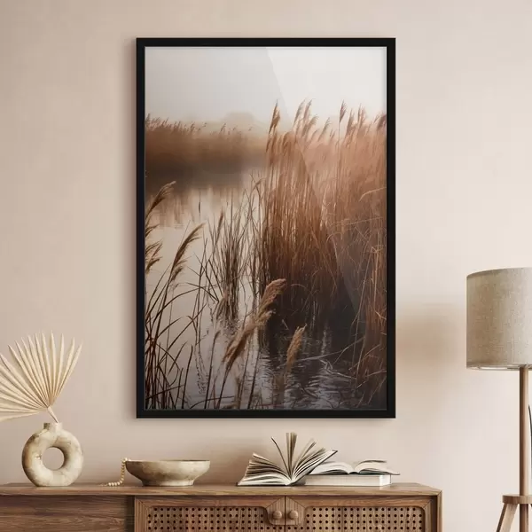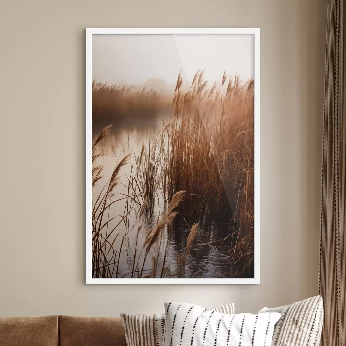 Poster Juncos altos que crecen en un cuerpo de agua, el agua refleja los juncos, fondo brumoso, luz suave, escena natural. f46695