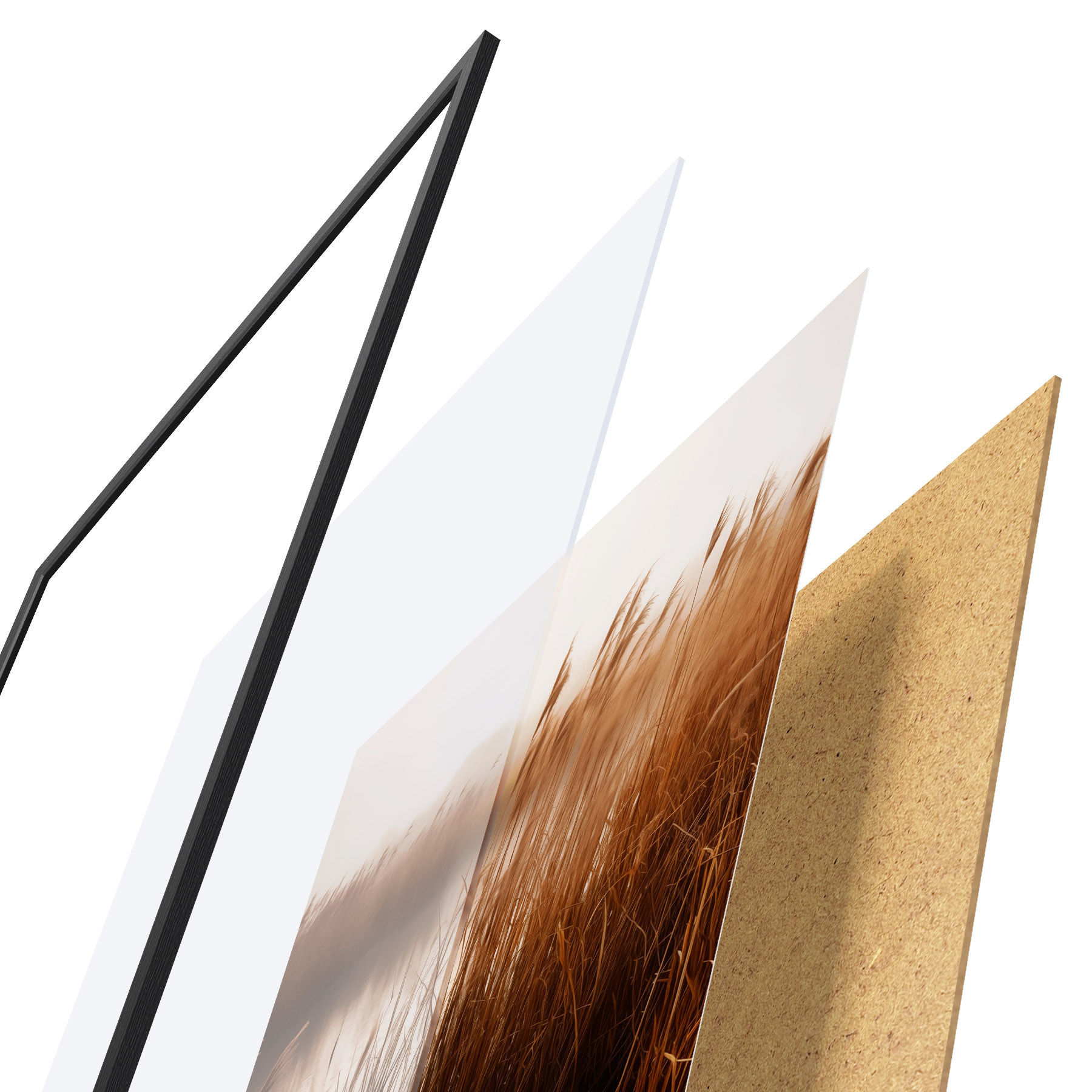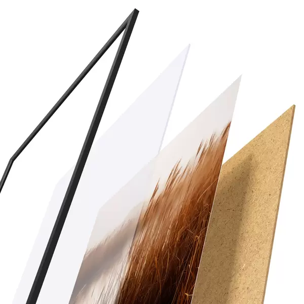 El póster consta de marco, plexiglás, imagen impresa y soporte de aglomerado. El póster puede colgarse inmediatamente en la pared gracias a los soportes de la parte posterior.