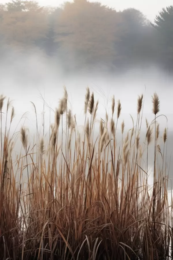 Poster Juncos altos que crecen en un cuerpo de agua, el agua refleja los juncos, fondo brumoso, luz suave, escena natural Nr f46696