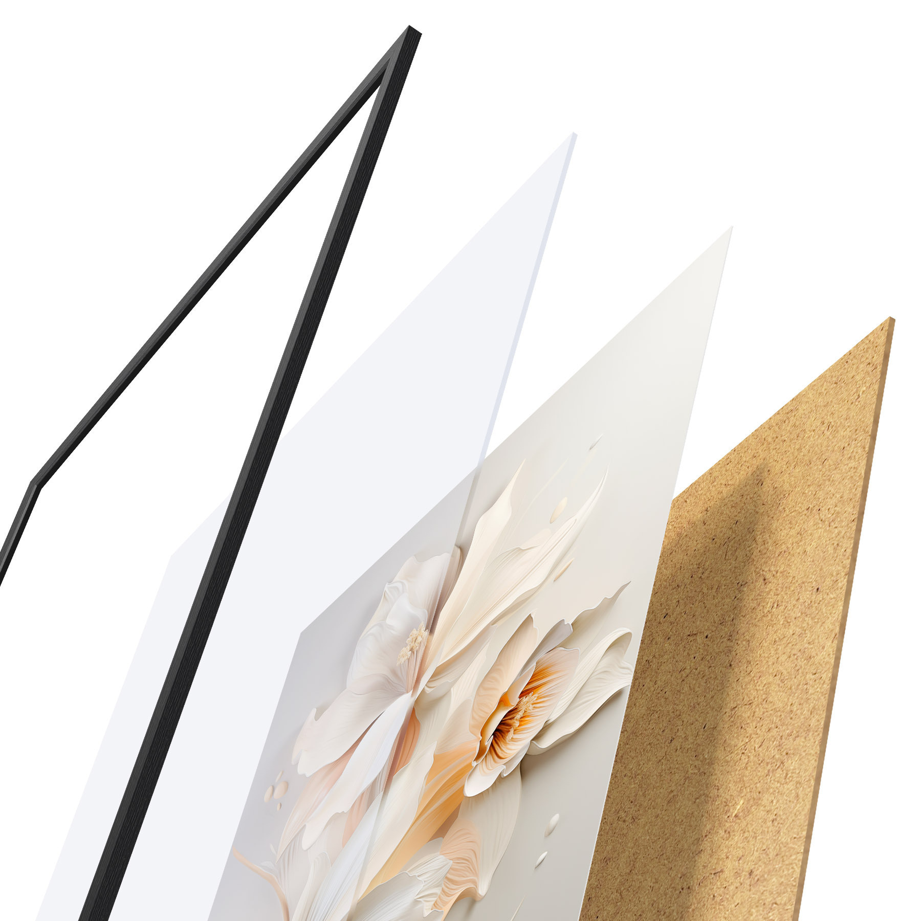 El póster consta de marco, plexiglás, imagen impresa y soporte de aglomerado. El póster puede colgarse inmediatamente en la pared gracias a los soportes de la parte posterior.