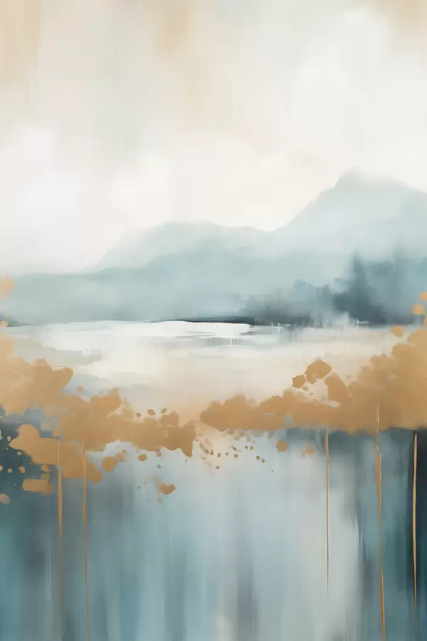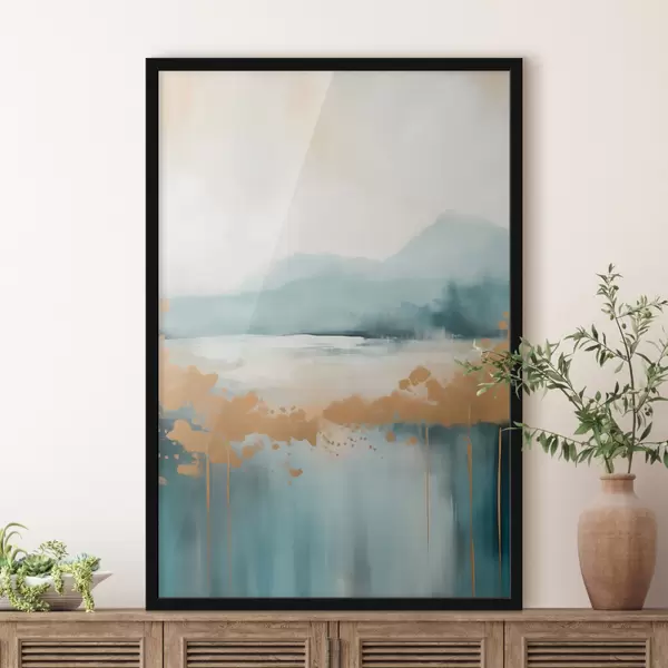 Poster Paisaje abstracto con montañas y lago en verde azulado y amarillo texturizado, pinceladas suaves, obra de arte minimalista. f46703