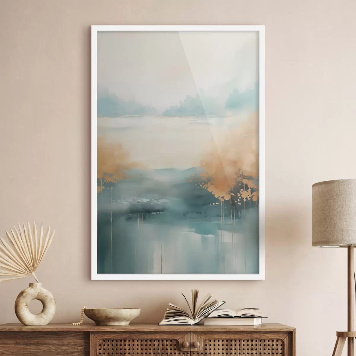 Poster Paisaje abstracto con montañas y lago en verde azulado y amarillo texturizado, pinceladas suaves, obra de arte minimalista. f46704