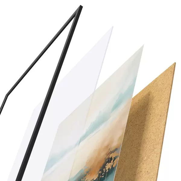 El póster consta de marco, plexiglás, imagen impresa y soporte de aglomerado. El póster puede colgarse inmediatamente en la pared gracias a los soportes de la parte posterior.