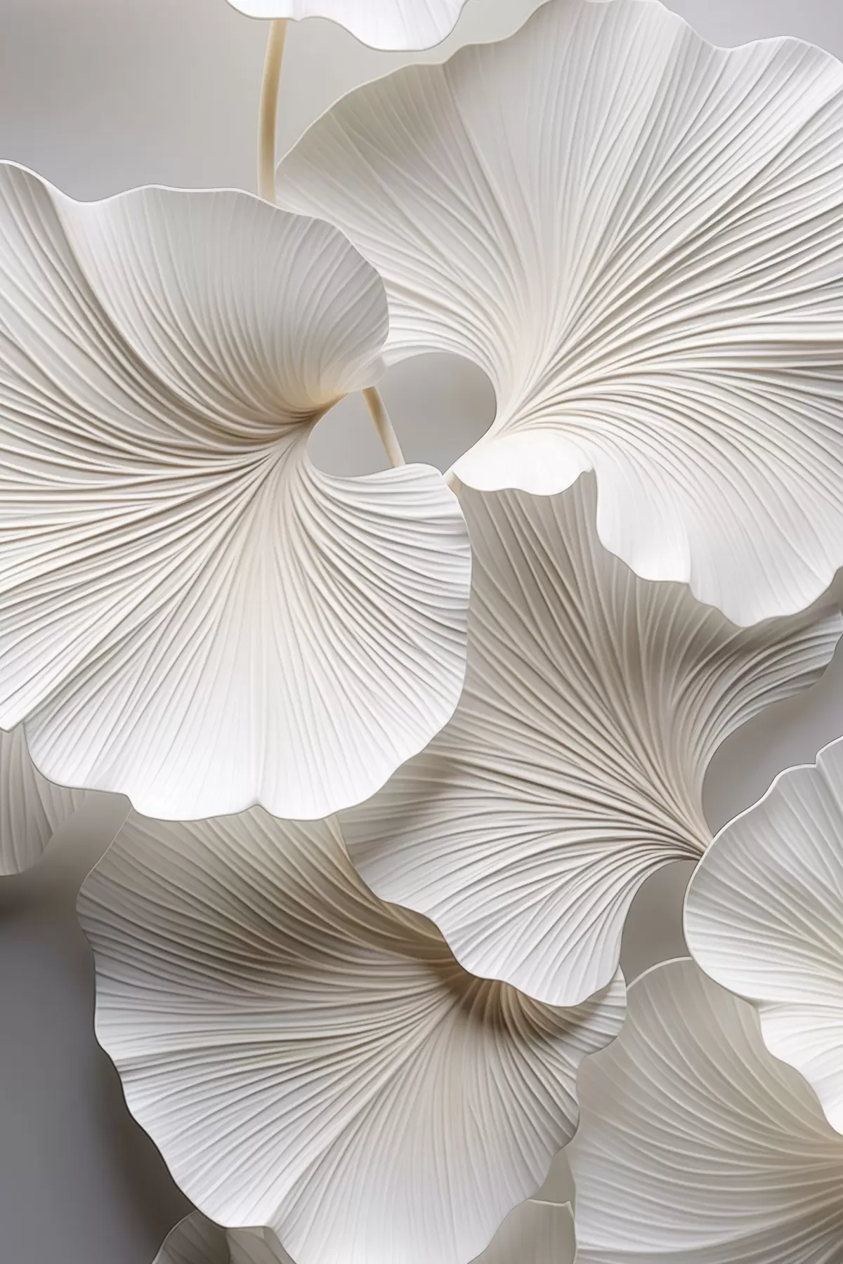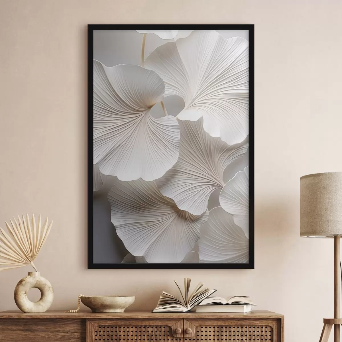 Poster Hojas blancas de ginkgo biloba con nervaduras detalladas, iluminación suave, diseño elegante y minimalista con textura. f46705