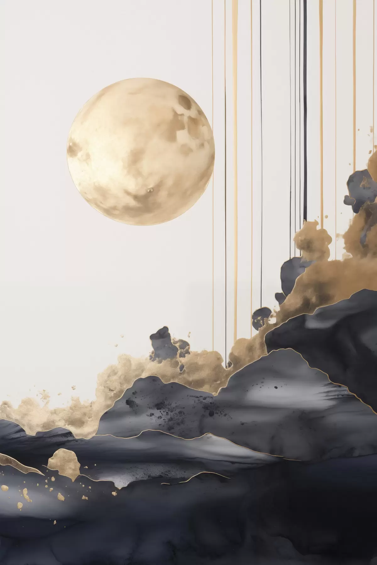Poster Luna llena con nubes negras y amarillas texturizadas, líneas verticales, estilo abstracto, minimalista y moderno. Nr f46707