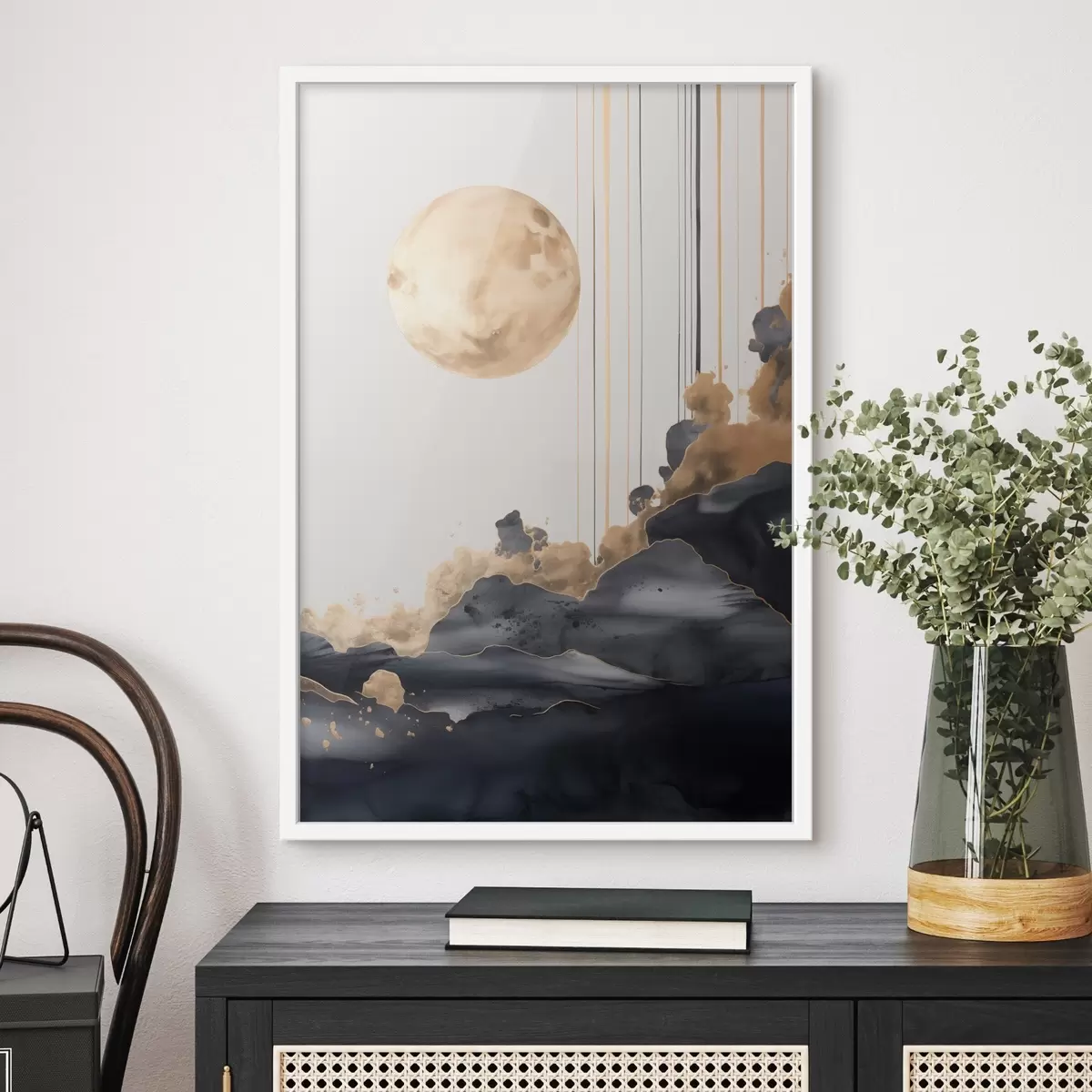Poster Luna llena con nubes negras y amarillas texturizadas, líneas verticales, estilo abstracto, minimalista y moderno. f46707