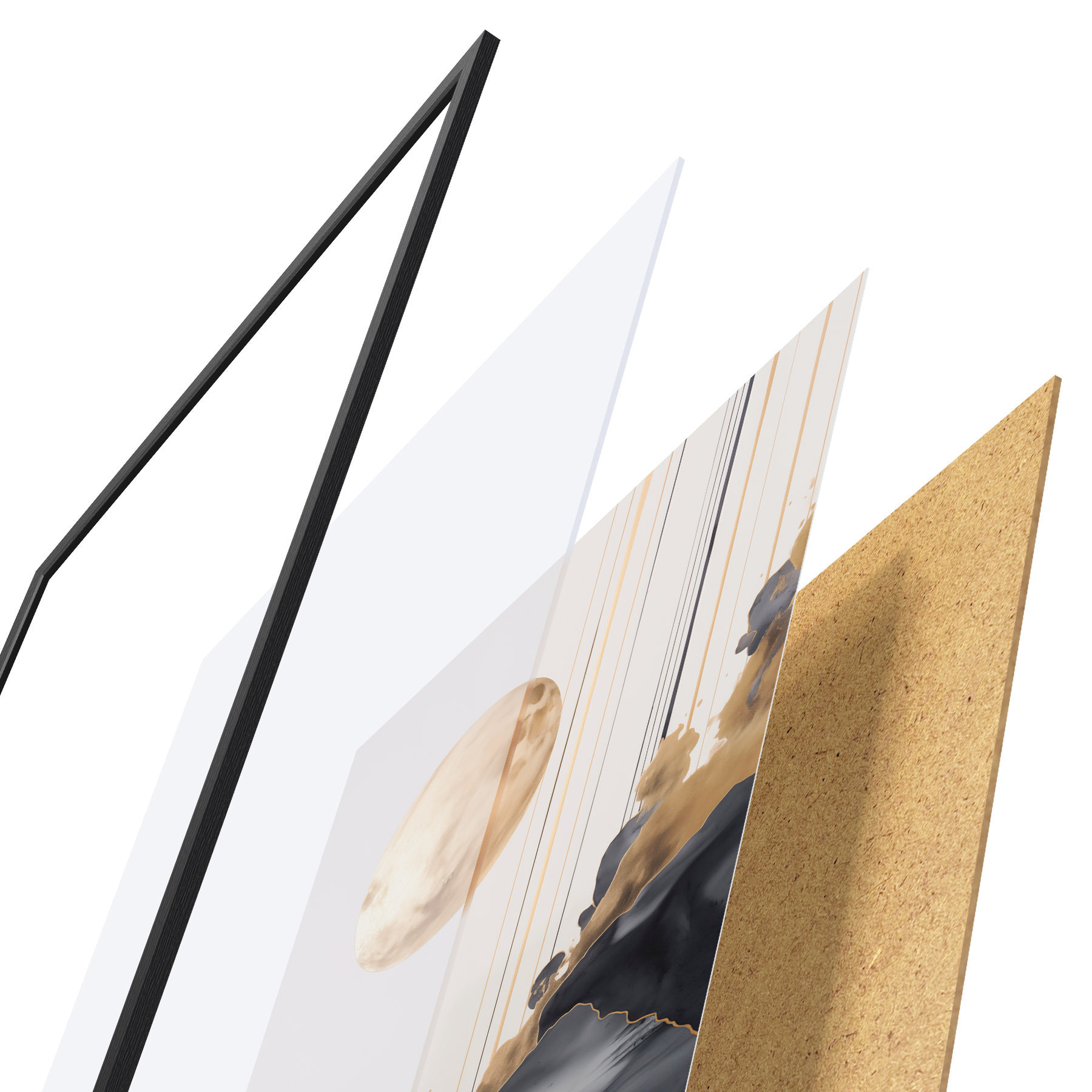 El póster consta de marco, plexiglás, imagen impresa y soporte de aglomerado. El póster puede colgarse inmediatamente en la pared gracias a los soportes de la parte posterior.