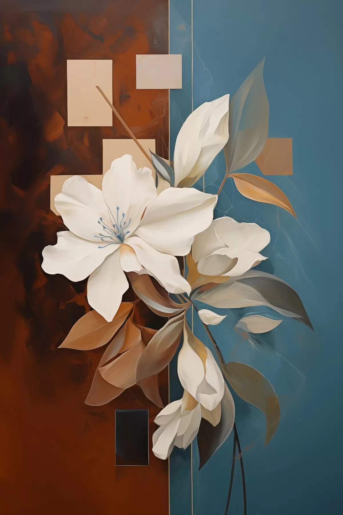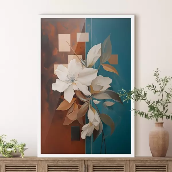 Poster Flores y hojas blancas abstractas con un fondo marrón y azul con formas abstractas, en un estilo minimalista. Nr f46709