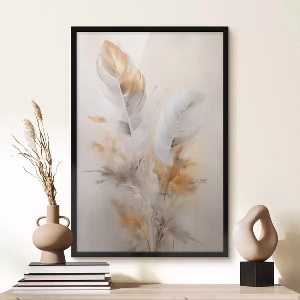Poster Plumas abstractas, rodeadas de plumas beige y marrones, suaves y delicadas, sobre un fondo beige claro. Nr f46711