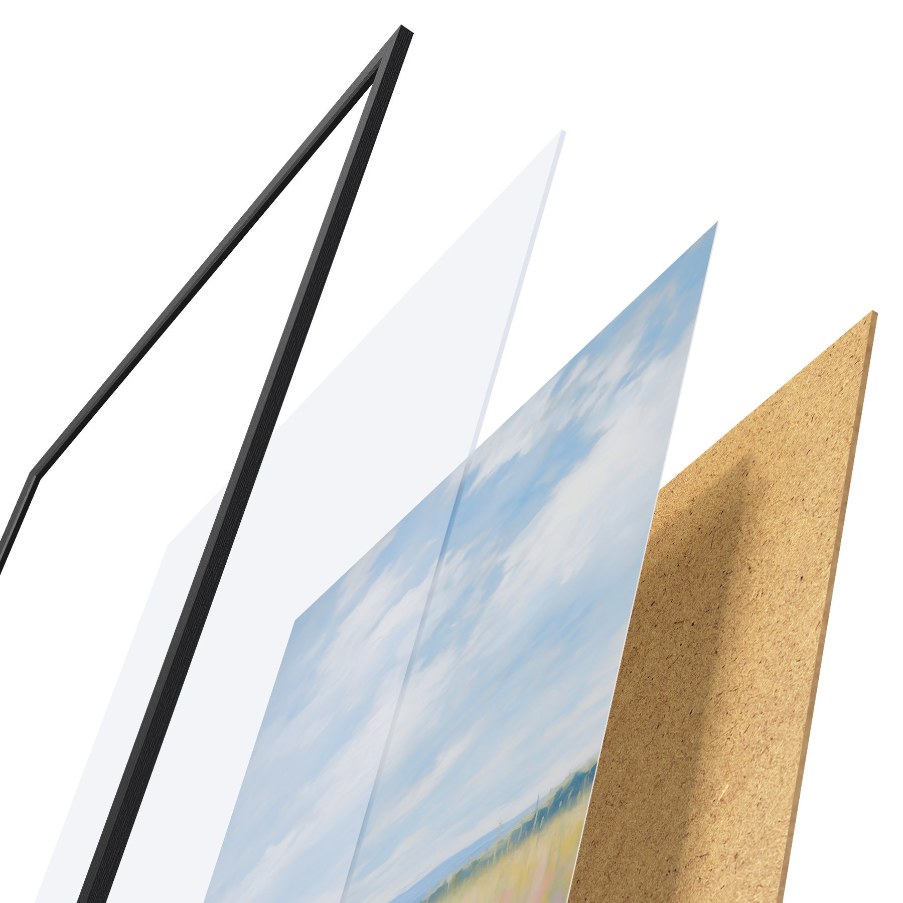 El póster consta de marco, plexiglás, imagen impresa y soporte de aglomerado. El póster puede colgarse inmediatamente en la pared gracias a los soportes de la parte posterior.