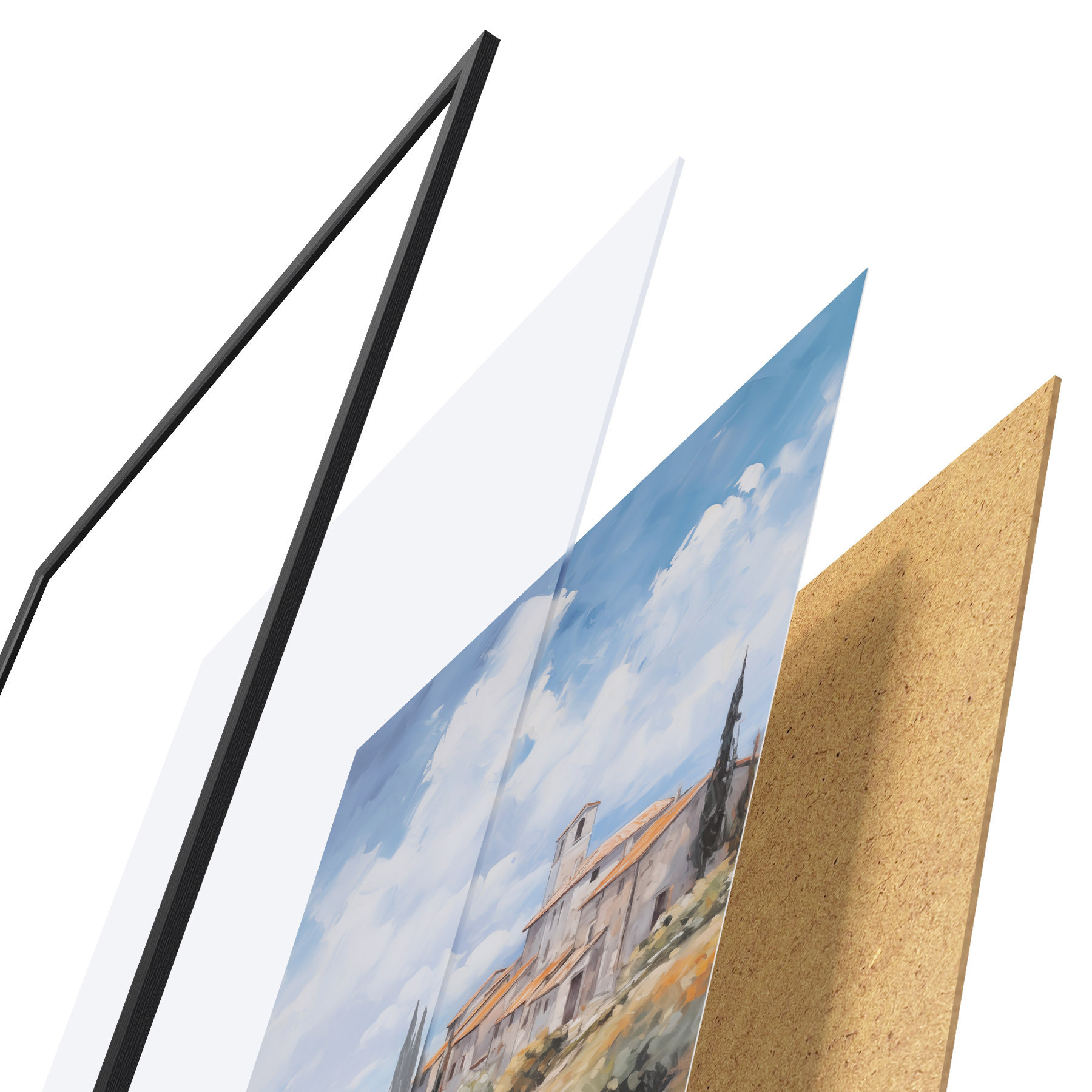 El póster consta de marco, plexiglás, imagen impresa y soporte de aglomerado. El póster puede colgarse inmediatamente en la pared gracias a los soportes de la parte posterior.