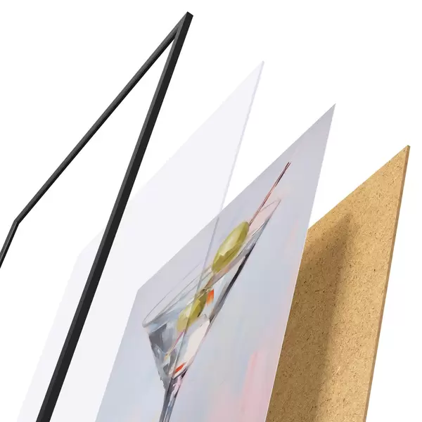 El póster consta de marco, plexiglás, imagen impresa y soporte de aglomerado. El póster puede colgarse inmediatamente en la pared gracias a los soportes de la parte posterior.