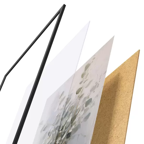 El póster consta de marco, plexiglás, imagen impresa y soporte de aglomerado. El póster puede colgarse inmediatamente en la pared gracias a los soportes de la parte posterior.