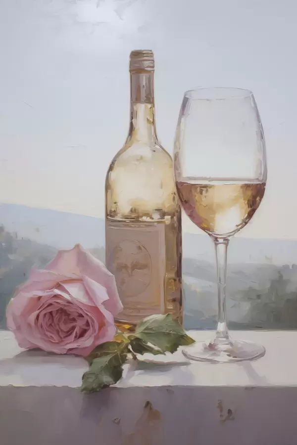 Poster Una botella y una copa de vino y un perro pequeño con gafas, pintura de imitación Nr f46721