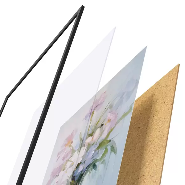 El póster consta de marco, plexiglás, imagen impresa y soporte de aglomerado. El póster puede colgarse inmediatamente en la pared gracias a los soportes de la parte posterior.