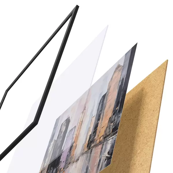 El póster consta de marco, plexiglás, imagen impresa y soporte de aglomerado. El póster puede colgarse inmediatamente en la pared gracias a los soportes de la parte posterior.
