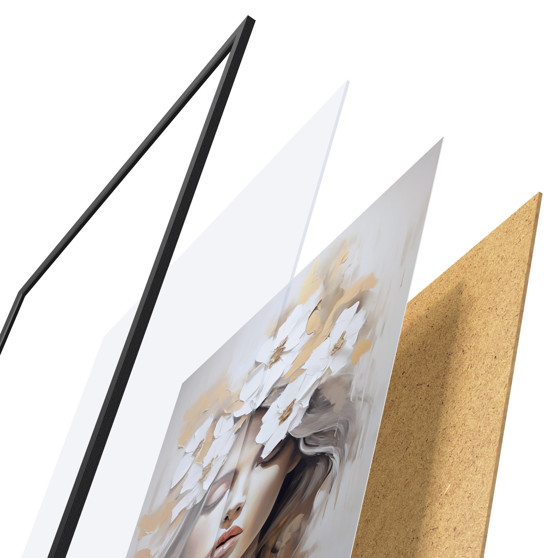 El póster consta de marco, plexiglás, imagen impresa y soporte de aglomerado. El póster puede colgarse inmediatamente en la pared gracias a los soportes de la parte posterior.