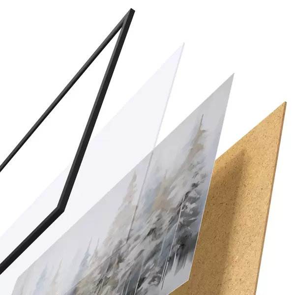 El póster consta de marco, plexiglás, imagen impresa y soporte de aglomerado. El póster puede colgarse inmediatamente en la pared gracias a los soportes de la parte posterior.