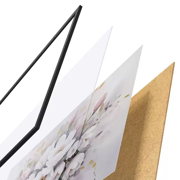 El póster consta de marco, plexiglás, imagen impresa y soporte de aglomerado. El póster puede colgarse inmediatamente en la pared gracias a los soportes de la parte posterior.