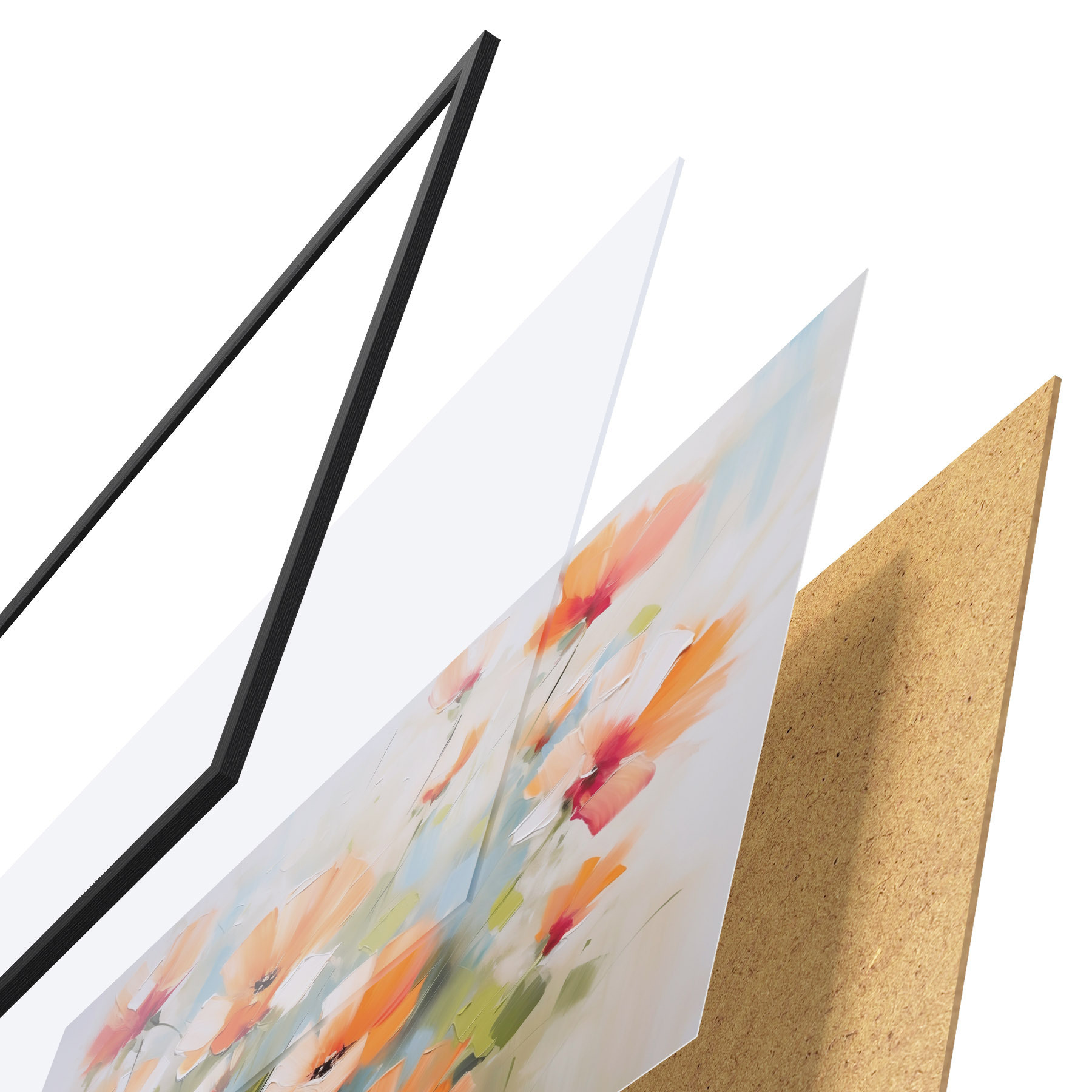El póster consta de marco, plexiglás, imagen impresa y soporte de aglomerado. El póster puede colgarse inmediatamente en la pared gracias a los soportes de la parte posterior.