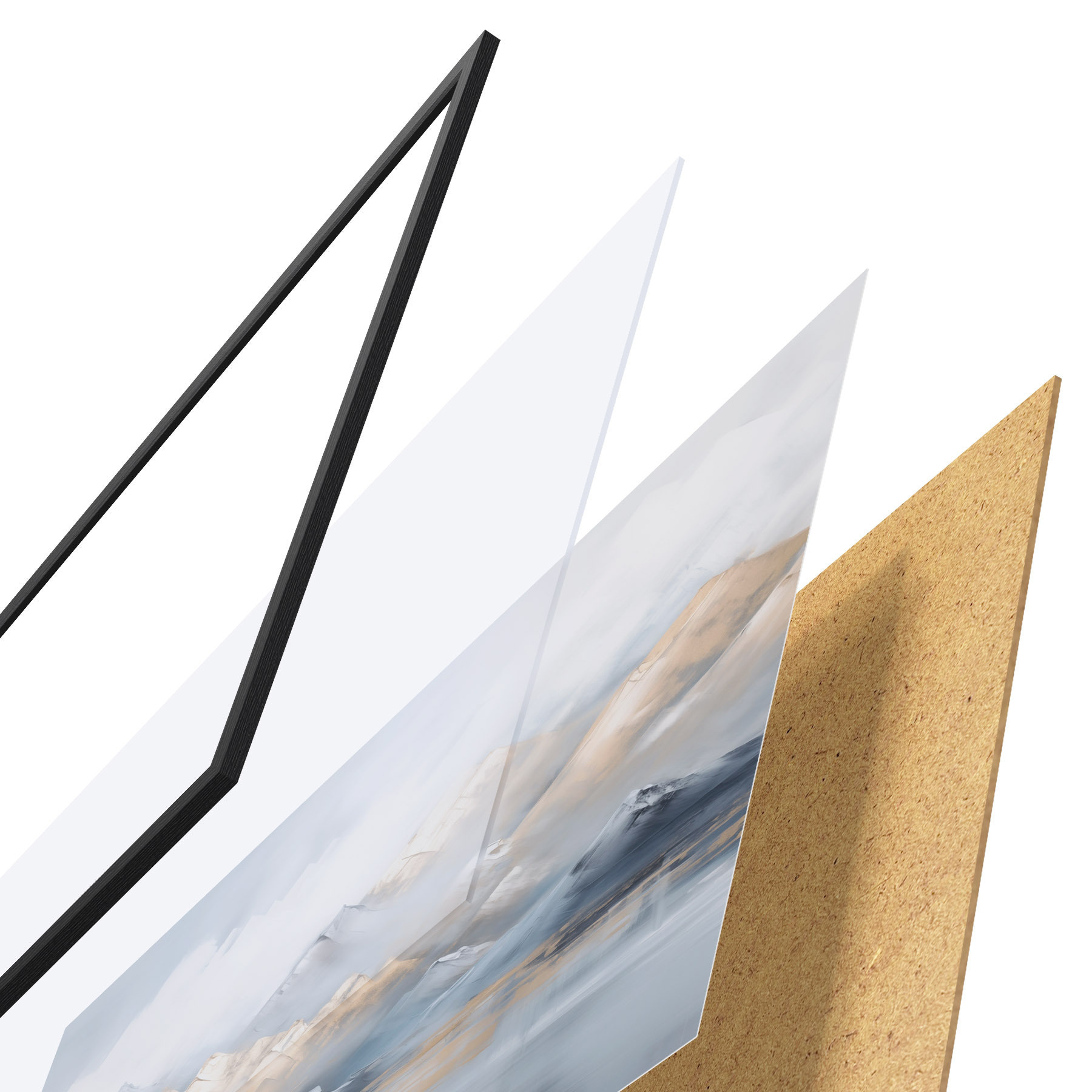 El póster consta de marco, plexiglás, imagen impresa y soporte de aglomerado. El póster puede colgarse inmediatamente en la pared gracias a los soportes de la parte posterior.