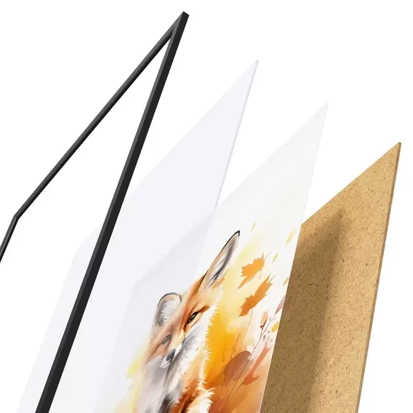 El póster consta de marco, plexiglás, imagen impresa y soporte de aglomerado. El póster puede colgarse inmediatamente en la pared gracias a los soportes de la parte posterior.