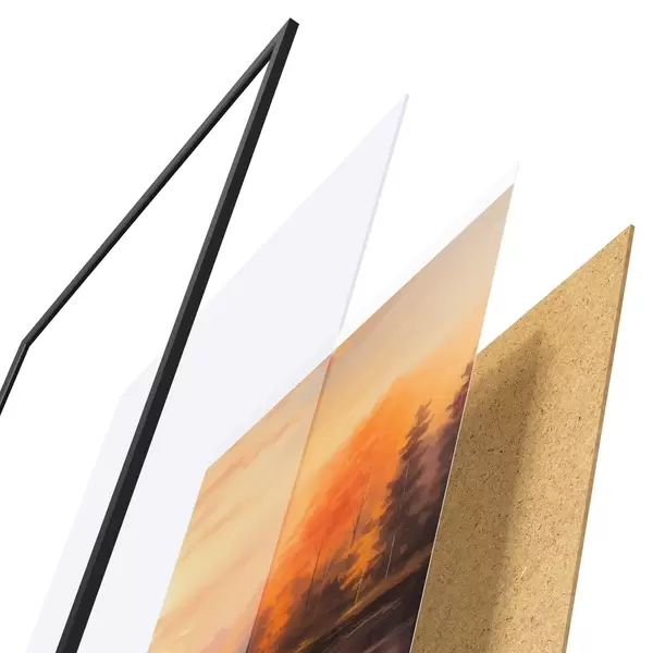 El póster consta de marco, plexiglás, imagen impresa y soporte de aglomerado. El póster puede colgarse inmediatamente en la pared gracias a los soportes de la parte posterior.