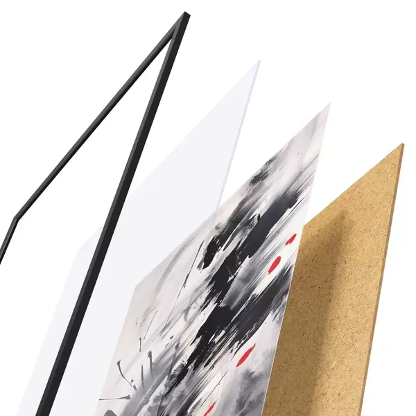 El póster consta de marco, plexiglás, imagen impresa y soporte de aglomerado. El póster puede colgarse inmediatamente en la pared gracias a los soportes de la parte posterior.