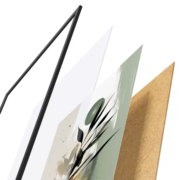 El póster consta de marco, plexiglás, imagen impresa y soporte de aglomerado. El póster puede colgarse inmediatamente en la pared gracias a los soportes de la parte posterior.