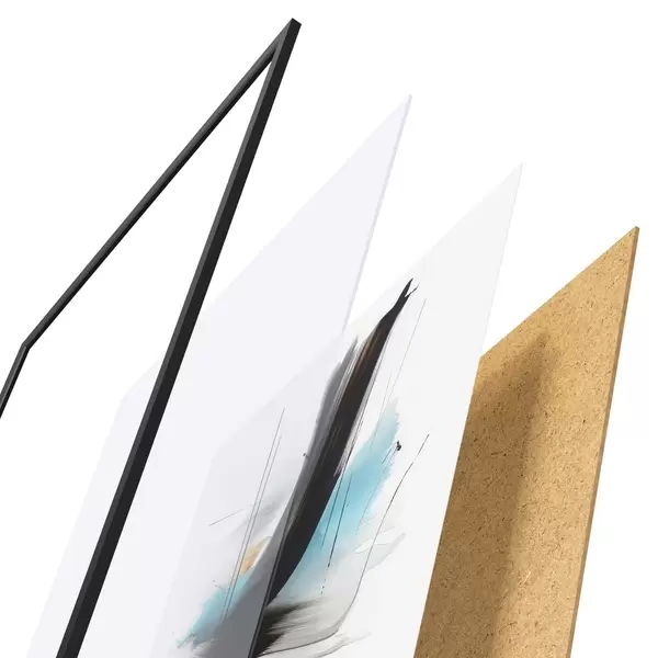 El póster consta de marco, plexiglás, imagen impresa y soporte de aglomerado. El póster puede colgarse inmediatamente en la pared gracias a los soportes de la parte posterior.