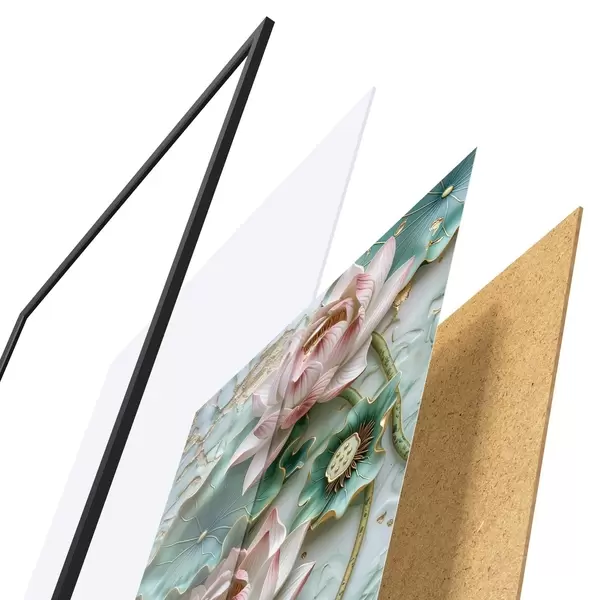 El póster consta de marco, plexiglás, imagen impresa y soporte de aglomerado. El póster puede colgarse inmediatamente en la pared gracias a los soportes de la parte posterior.