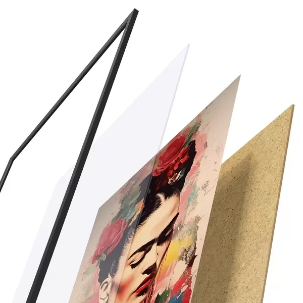 El póster consta de marco, plexiglás, imagen impresa y soporte de aglomerado. El póster puede colgarse inmediatamente en la pared gracias a los soportes de la parte posterior.